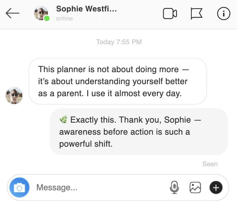 It’s a family-centered planner-workbook that combines reflection, values-based planning, emotional wellbeing, and self-care — created specifically for parents.
